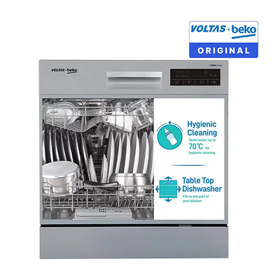 You can add ease to your kitchen chores with the Voltas Beko DT8B Dishwasher. Its small and compact size makes it a suitable addition to your kitchen. Featuring up to six wash programmes, this dishwasher effortlessly washes different dishes including your glass utensils. Also, its Clean and Shine programme can wash and dry your slightly stained dishes in a hassle-free manner. Furthermore, this dishwasher is integrated with an Intensive 70ºC function that cleans your dishes with high-temperature water jets.